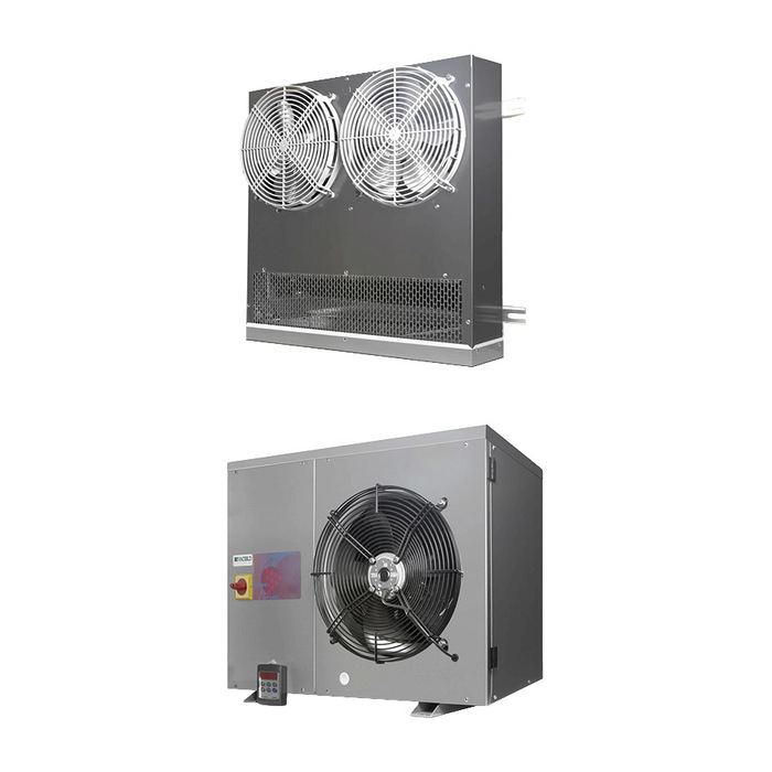 - Состоит из компрессорно-конденсаторного блока (наружного) и воздухоохладителя (внутреннего)