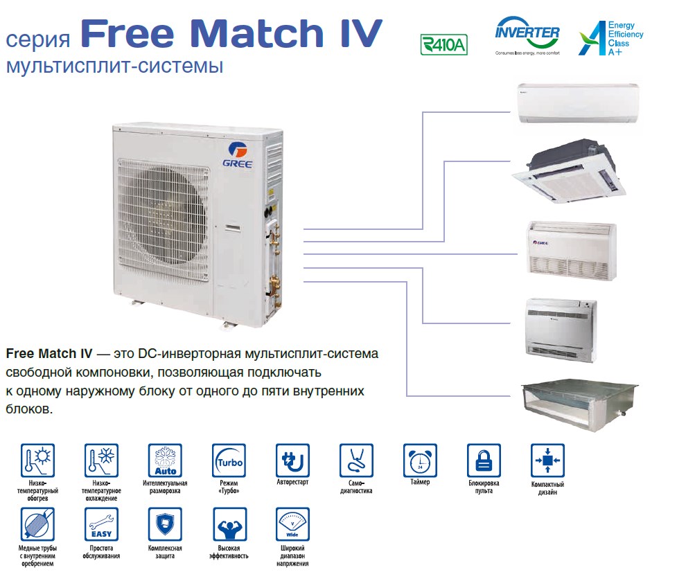 Надежные и качественные наружные блоки Free Match отличаются низким уровнем шума и высокой экономичностью. Наружные блоки оснащены DC-инверторным компрессором с технологией G10-Matrix и позволяют подключать до 5 внутренних блоков различного типа и мощности. Использование в системах на основе этих блоков экологически безопасного хладагента R410A обеспечивает наружному блоку соответствие экологическим нормам Евросоюза.