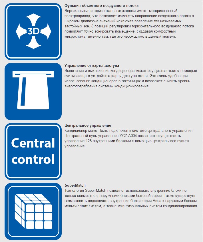 Внутренние блоки напольно-потолочного исполнения Haier имеют элегантный дизайн, компактные размеры, высокий класс энергетической эффективности. Они специально спроектированы для кондиционирования больших помещений. Их можно устанавливать в горизонтальном положениии на потолке либо в вертикальном положении на стене. Центробежный вентилятор формирует мощный, направленный воздушный поток для равномерного распределения обработанного воздуха в рабочей зоне кондиционируемого помещения.