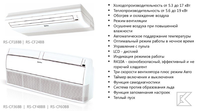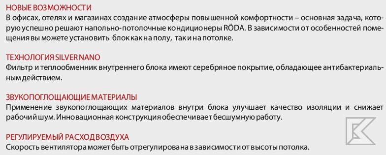 В офисах, отелях и магазинах создание атмосферы повышенной комфортности - основная задача, которую успешно решают напольно-потолочные кондиционеры Roda. В зависимости от особенностей помещения вы можете установить блок как на полу, так и на потолке.
