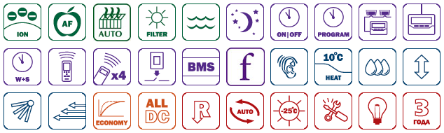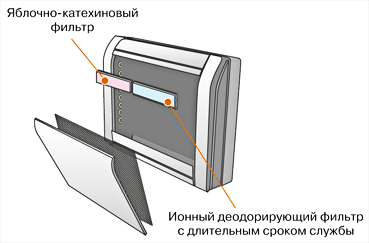 Внутренние блоки имеют очень низкий уровень шума, практически не уловимый человеческим ухом. В комплекте поставляются ионный деодорирующий фильтр и яблочно-катехиновый фильтр, обеспечивающие тонкую очистку воздуха.