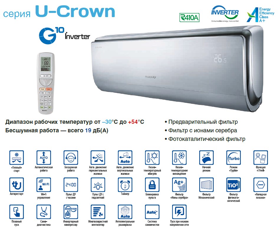 Кондиционер GREE KFR-35GW/(35571)FNBh-1 / GWH12UB-K3DNA4F относится к инверторным сплит-системам настенного типа серии U-CROWN. Современная модель с большим набором функциональных возможностей и отличными шумовыми характеристиками, что достигается использованием вентиляторов с особым аэродинамическим профилем лопастей. Внутренний блок выполнен в современном стиле, имеет компактные размеры и оснащен информативным дисплеем. Разборная конструкция корпуса значительно упрощает проведение профилактического обслуживания и замену фильтров. Система фильтрации трехступенчатая, помимо предварительного фильтра грубой очистки, установлены “серебряный” и фотокаталитический фильтры. Особый комфорт для пользователя создает наличие режима I FEEL и функции “Теплый старт”. В первом случае заданный температурный режим поддерживается непосредственно там, где находится пульт ДУ со встроенным термодатчиком, во втором – исключается подача в помещение холодного воздуха в режиме обогрева. Для быстрого охлаждения или обогрева помещения можно воспользоваться режимом повышенной производительности TURBO. Схема воздухораспределения позволяет равномерно обрабатывать все помещение, создавая объемный воздушный поток благодаря согласованной работе вертикальных и горизонтальных заслонок. Также, можно отрегулировать направление потока вручную. Система некритична к условиям монтажа, имеет дополнительный электрический нагреватель, сохраняет работоспособность при отрицательных температурах наружного воздуха (до -30°С), комплектуется полнофункциональным беспроводным пультом дистанционного управления со встроенным термодатчиком. В конструкции наружного блока использован инверторный компрессор G10, обеспечивающий стабильную работу системы при очень низких оборотах и практически полном отсутствии вибрации.