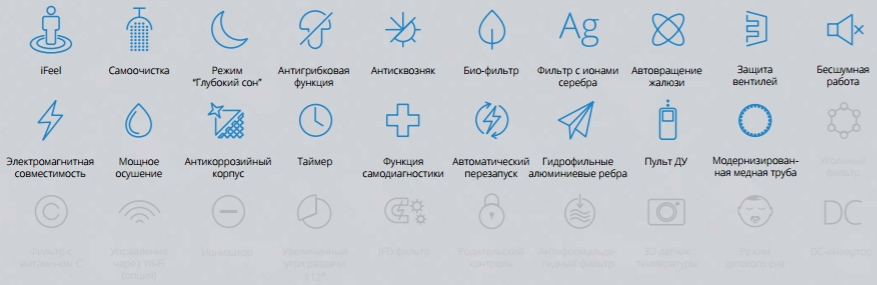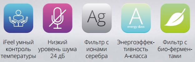 Уникальный дизайн. Автоматические горизонтальные и вертикальные жалюзи; Используется ABS пластик без примесей; Класс энергоэффективности A; 4 скорости вращения вентилятора; Уровень шума 24 dB; Функции самоочистки; Функция «Авторестарт»; Возможность работы при напряжении 185 В; Дополнительная защитная сетка теплообменника наружного блока; Фильтры опционально: Антиформальдегидный, Био-фильтр, Фильтр с ионами серебра, Фильтр с витамином С, Угольный фильтр, Фильтр с отрицательными ионами.