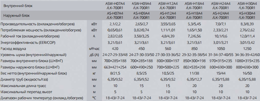 Технические характеристики кондиционеров AUX серии Smart LK700 On/Off