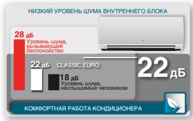 Минимальный уровень шума при работе кондиционера Classic Euro составляет всего 22 дБ. Его можно сравнить с шепотом на расстоянии 1 м. В реальных условиях городской квартиры шумы ниже 23–25 дБ практически не слышны. На практике это приводит к тому, что работа внутреннего блока кондиционера ощущается как почти беззвучная. Минимальный уровень шума особенно важен при работе кондиционера ночью.