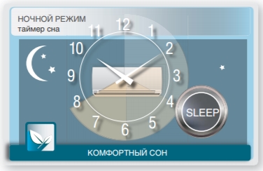 Комфортный сон требует температуры, отличной от температуры в период бодрствования. При нажатии кнопки SLEEP кондиционер будет автоматически изменять температуру в по- мещении: плавно понижать на 4 градуса при работе на обогрев (в течение первого часа на 2 градуса и за следующие 60 минут еще на 2 градуса) или повышать на 2 градуса при работе на охлаждение. Продолжительность работы в данном режиме может составлять от 30 мин до 9 часов.
