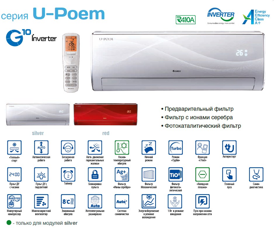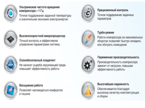 Рассматриваемая модель имеет высокой уровень экономии электроэнергии, удобства эксплуатации и надежности составляющих элементов. Благодаря новым технологиям, которые имеют мировое признание, достигается хорошая производительность и точное поддержание температуры воздуха. Система автоматически подстраивается под перепады в сети, что дает возможность полноценно работать при чрезвычайно низких или высоких показателях напряжения. Удобный пульт управления со встроенным датчиком температуры.