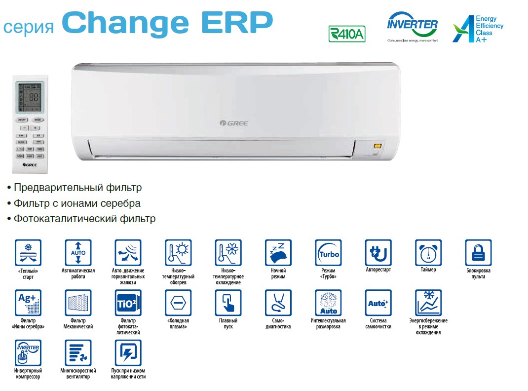 Инверторный кондиционер GREE серии CHANGE ERP GWH09KF-K3DNA6G новинка 2017 года, представляющая собой новое поколение линейки CHANGE. В отличие от предшествующего поколения, в новой серии появилась функция ионизации (COLD PLAZMA генератор). Предустановлен и зимний комплект, позволяющий кондиционерам обогревать помещение при морозах до -20°С.