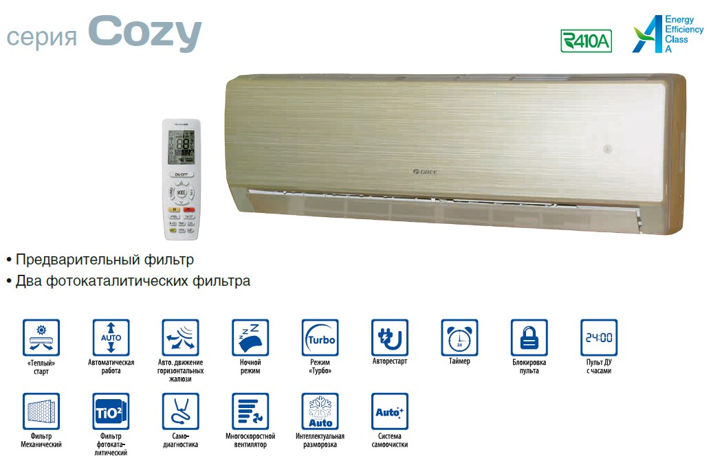 Данная серия климатических устройств под названием Gree Cozy обладает совершенно новой и уникальной конструкцией внутреннего блока. Теперь ухаживать, мыть или чистить ваш кондиционер станет намного легче. Его обслуживание также станет гораздо проще. Данная серия сплит-систем оснащается нанофильтрами и обладает специальной функцией самоочистки. Фреон, на котором работают кондиционеры Cozy, относится к озонобезопасным и имеет маркировку R410A.