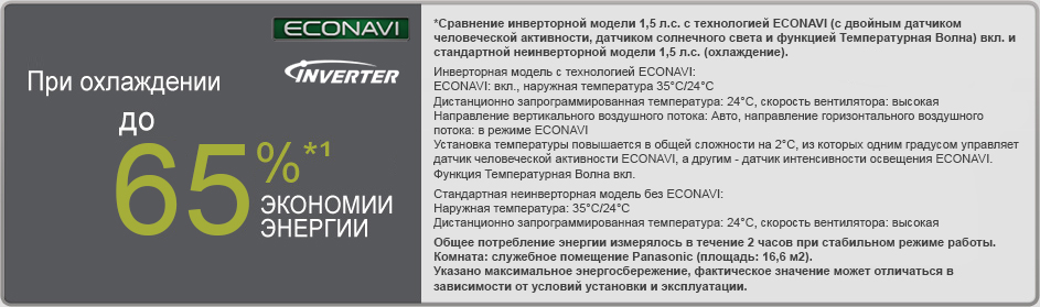 Система ECONAVI с помощью датчика солнечного света и датчика человеческой активности контролирует местоположение и движение людей или их отсутсвие в помещении, а также интенсивность солнечного света. ECONAVI экономит энергию, т.к. система определяет: Ваше расположение, Вашу активность, когда Вас нет в комнате, какое сейчас время суток (день или ночь).