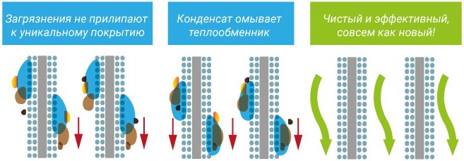 Уникальное покрытие теплообменникасплит-системы Seiya предотвращает скопление пыли и грязи на поверхности. Все загрязнения легко смываются конденсированной водой.