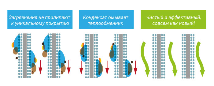 Уникальное покрытие теплообменника предотвращает скопление пыли и грязи на поверхности. Все загрязнения легко смываются конденсированной водой.