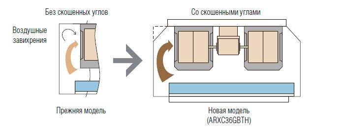 Благодаря скошенным углам лицевой панели внутреннего блока и специальному кожуху вентилятора была значительно снижена турбулентность воздушного потока внутри кондиционера. Применение пластиковой крыльчатки и корпуса вентилятора позволило оптимизировать воздушный поток.