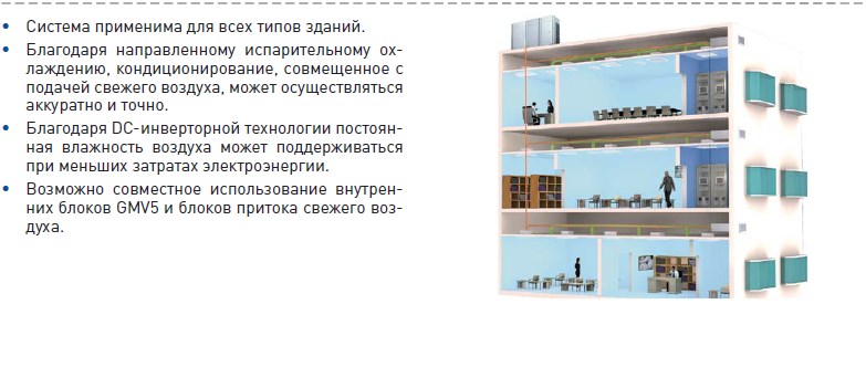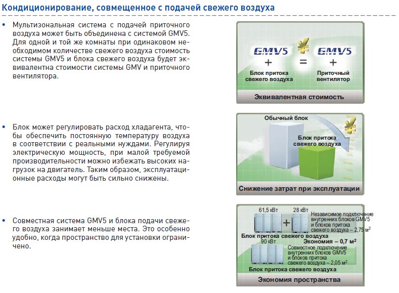 • Мультизональная система с подачей приточного воздуха может быть объединена с системой GMV5. Для одной и той же комнаты при одинаковом необходимом количестве свежего воздуха стоимость системы GMV5 и блока свежего воздуха будет эквивалентна стоимости системы GMV и приточного вентилятора.