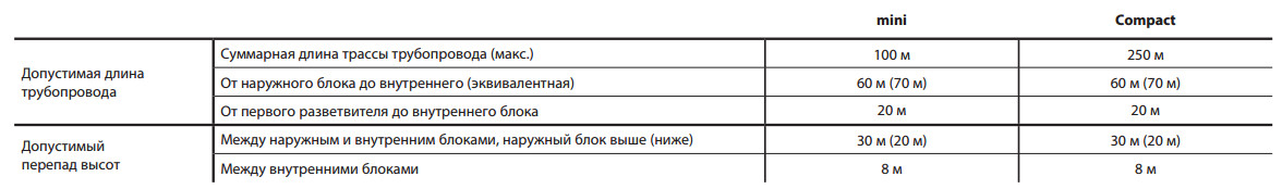 Суммарная длина трубопровода хладагента может достигать 1000 м, максимальная длина трубопровода от наружного блока до наиболее удаленного внутреннего блока — 200 м (эквивалентная) и 175 м (фактическая). Максимальный перепад высот между наружным и внутренним блоком составляет 70 м, если первый из них выше второго, и 110 м, если первый из них ниже второго, а максимальный перепад высот между внутренними блоками — 30 м. Максимальное удаление внутреннего блока от первого разветвителя составляет 40 м (Длина трубопровода от первого разветвителя до внутреннего,при соблюдении ряда условий может быть увеличена до 90 м).