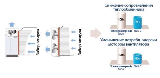 В серии SMSC используется высокоэффективный конденсатор, который обдувается горизонтальным потоком воздуха. Подобное решение позволяет увеличить эффективность теплообменника и снизить потребляемую мощность