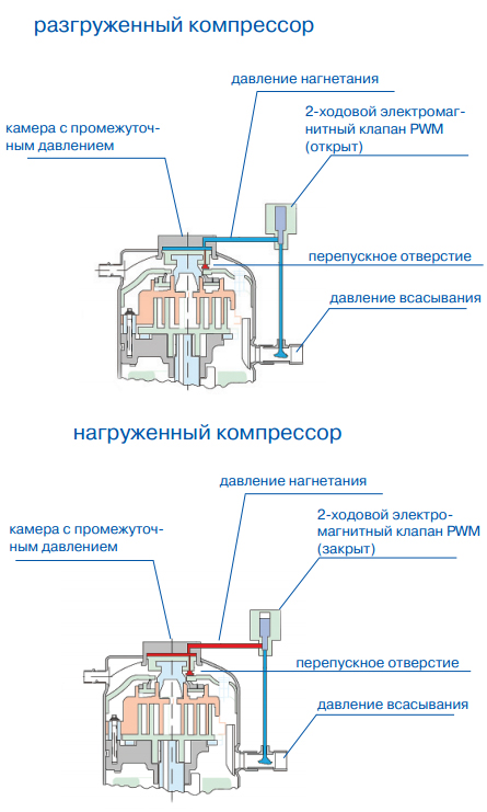 Основными элементами компрессора, позволяющими регулировать производительность, являются электромагнитный клапан и верхняя спираль. Смещение верхней неподвижной спирали на 1 мм вверх позволяет компрессору работать на прежней скорости, но без осуществления сжатия и циркуляции фреона. При этом потребляемая мощность составляет 10% номинальной, поскольку сжатия фреона не происходит. Поднимает и опускает спираль специальный соленоидный клапан PWM, установленный между магистралью низкого давления и специальной камерой, находящейся над верхней спиралью компрессора.