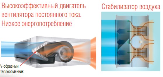 Низкий уровень шума обеспечивается за счет стабилизатора воздушного потока, который уравнивает скорость и объем воздуха, проходящего через теплообменник.