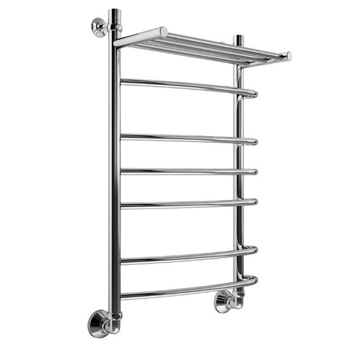 Полотенцесушитель Маргроид Цунами с полкой представляет собой современный агрегат типа «лесенка», исполненный в оригинальном привлекательном дизайне. Удобная небольшая полочка, пристроенная в верхней части полотенцесушителя и выполненная в том же стиле что и основные детали, поможет с комфортом просушить вещи, которые неудобно размещать на узких перекладинах.