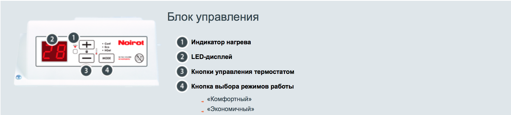 Электронная автоматика выдерживает перепады напряжения от 150 В до 242 В, что наиболее актуально при частых «скачках» напряжения. На случай возможных перебоев с электропитанием в обогревателях предусмотрена функция авторестарта, восстанавливающая работу прибора в прежнем режиме.