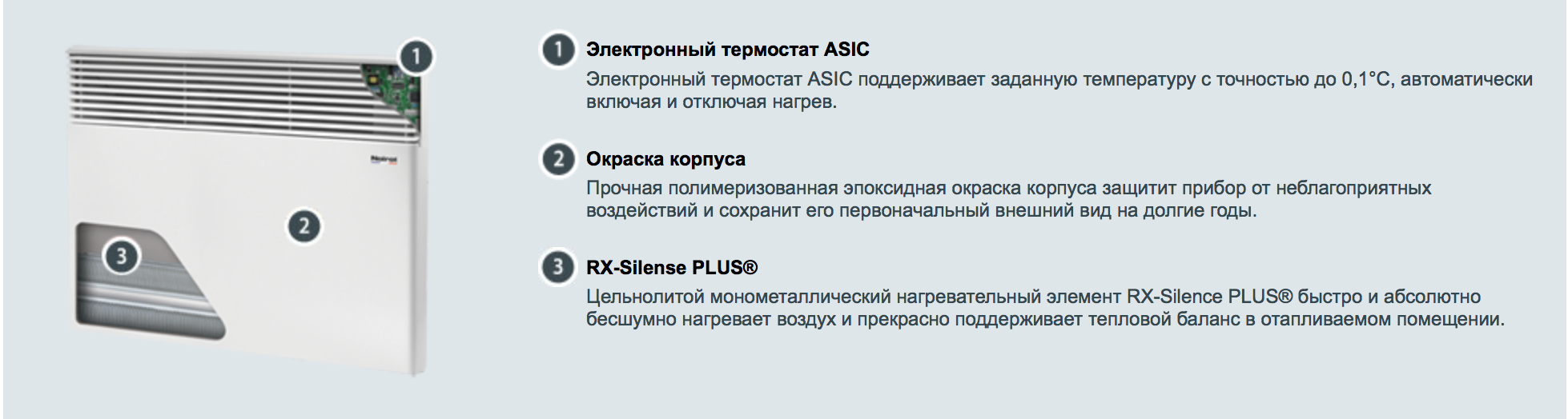 Конструктивные особенности конвекторов серии Spot E-4 исключают возникновение посторонних шумов при нагреве и остывании электрических обогревателей и гарантируют полную безопасность в эксплуатации (отсутствие острых углов, нагрев поверхности не выше 60°С).