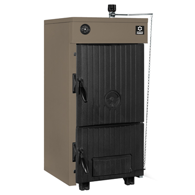 Поверхность теплообмена увеличена за счет дополнительных ребер в каналах отходящих дымовых газов, в результате чего достигается высокий КПД. Механический термостат, входящий в комплект поставки, позволяет регулировать температуру теплоносителя, подаваемого в систему отопления, и увеличить время горения топлива. Для визуального контроля температуры теплоносителя на передней панели котла установлен термометр. Котлы оборудованы регулятором вторичного воздуха, который оказывает непосредственное влияние на снижение уровня выбросов в атмосферу. Колосники котлов являются водоохлаждаемыми, что обеспечивает долгий срок их службы. Котлы Elegant могут работать на дровах и угле, а так же рекомендуется топливо в виде брикетов, антрацита. В комплект поставки входят приспособления для проведения технического обслуживания.|