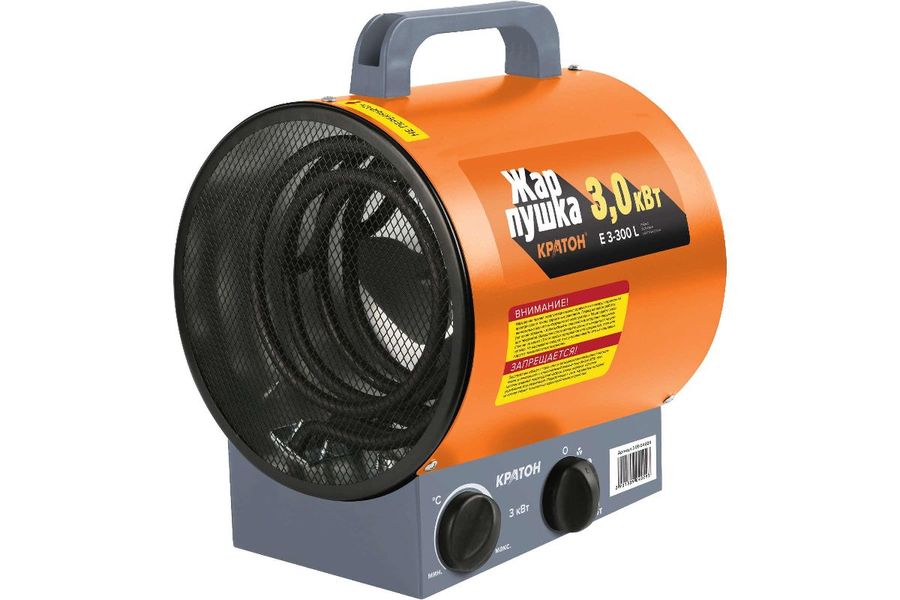 Отопительный агрегат со скромными размерами корпуса Кратон Жар-пушка Е 3-300 L нагревает воздух с помощью трубчатого нагревательного элемента. Преимуществом устройства является экономия электроэнергии, которая обеспечивается особым строением корпуса. Встроенный терморегулятор поддерживает комфортную температуру в помещении.