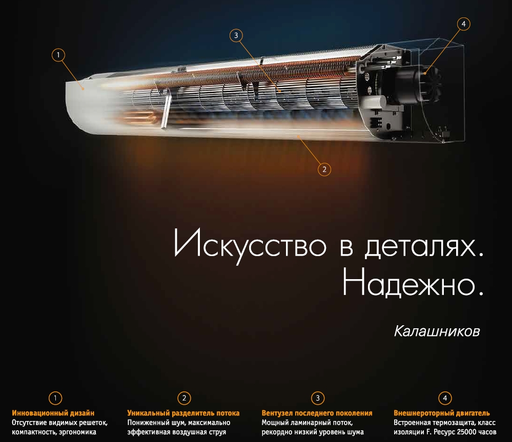 - Технологические решения, применяемые в завесах KALASHNIKOV — геометрия и технология изготовления корпуса, колесо PUNKER, индивидуально разработанная решетка — позволили добиться рекордно низкого уровня шума, в среднем на 2 дБ(А) ниже от ближайших аналогов.