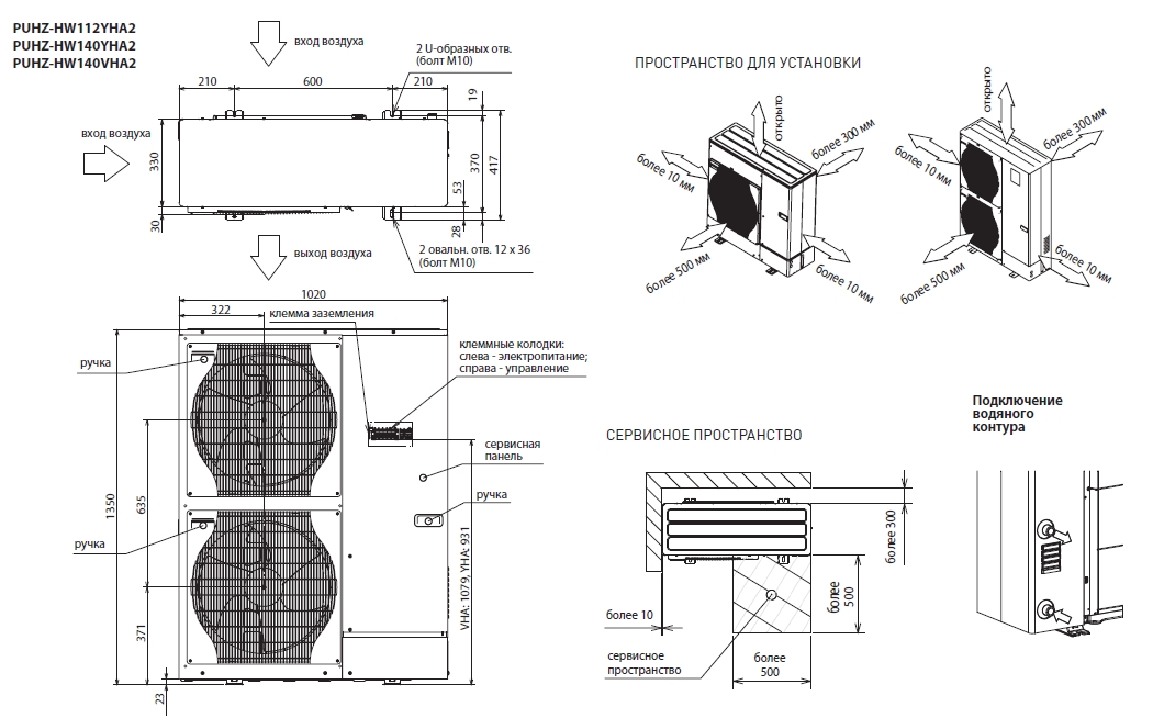 Размеры (габбариты) наружных блоков Mitsubishi Electric PUHZ-HW112YHA , PUHZ-HW140VHA и PUHZ-HW140YHA :